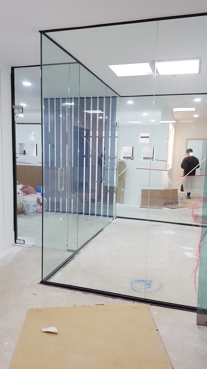 기존 칸막이(경량칸막이)는 폐쇄된 공간을 분할을 하였으나 유리칸막이는 공간을 분할하되 열린공간 이미지를 주며, 특히 좁은 공간을 분할할 때 강화유리 파티션을 하면 안전하고 넓게 보입니다. 재질은 투명강화 및 칼라강화유리이며, 투명강화유리에는 인테리어 필름으로 다양한 이미지 표현을 할 수 있습니다.