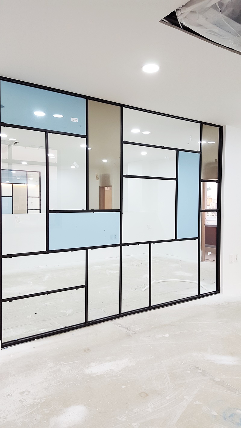 기존 칸막이(경량칸막이)는 폐쇄된 공간을 분할을 하였으나 유리칸막이는 공간을 분할하되 열린공간 이미지를 주며, 특히 좁은 공간을 분할할 때 강화유리 파티션을 하면 안전하고 넓게 보입니다. 재질은 투명강화 및 칼라강화유리이며, 투명강화유리에는 인테리어 필름으로 다양한 이미지 표현을 할 수 있습니다.