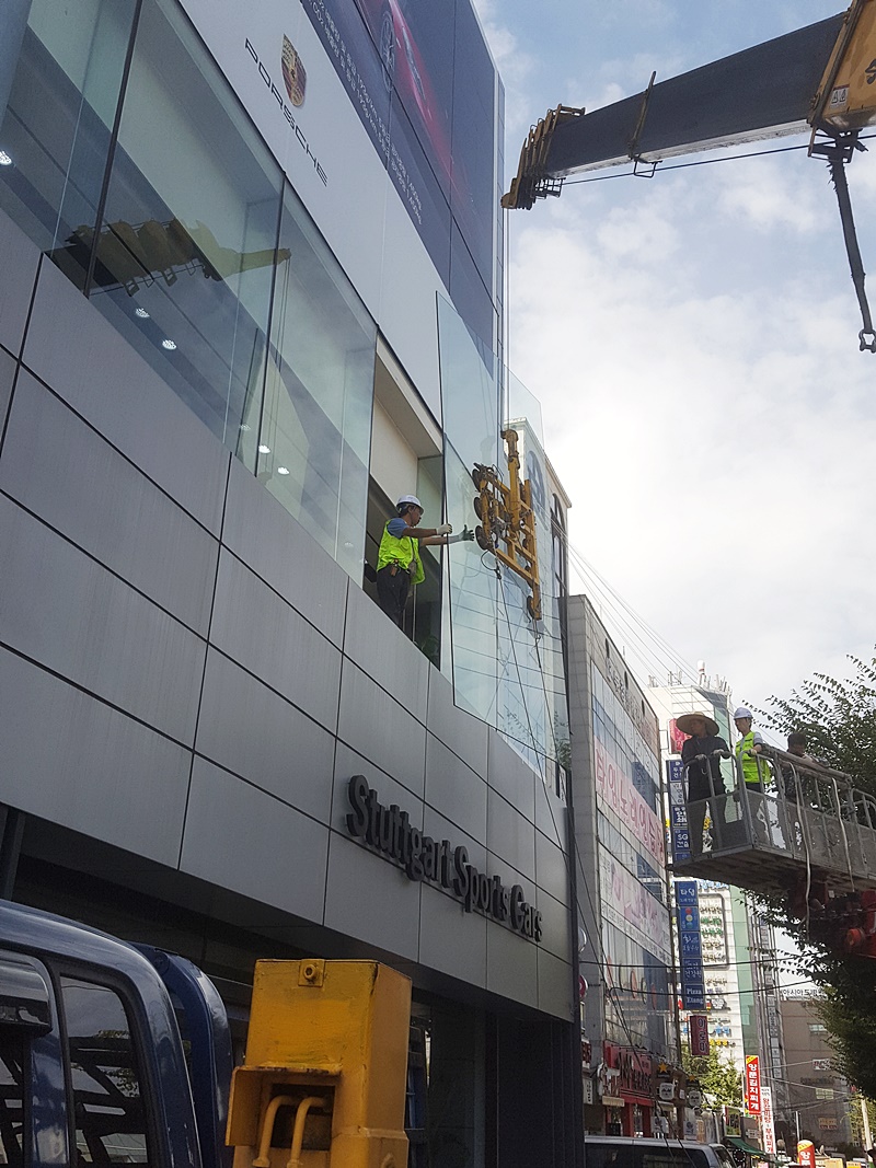 포르쉐 전시장 대형 강화유리 시공현장